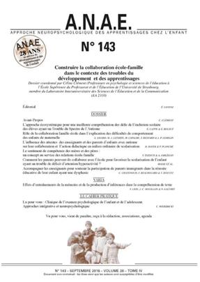 ce numéro d’A.N.A.E. allie des contributions francophones portant sur divers versants de la question du lien entre l’école et la famille. Il tente d’offrir un panorama actuel. Et s’il se focalise sur les troubles neurodéveloppementaux comme le trouble du spectre de l’autisme, le trouble déficit de l’attention/hyperactivité, la dysphasie, il permet au travers des différents articles d’offrir des perspectives plus larges.